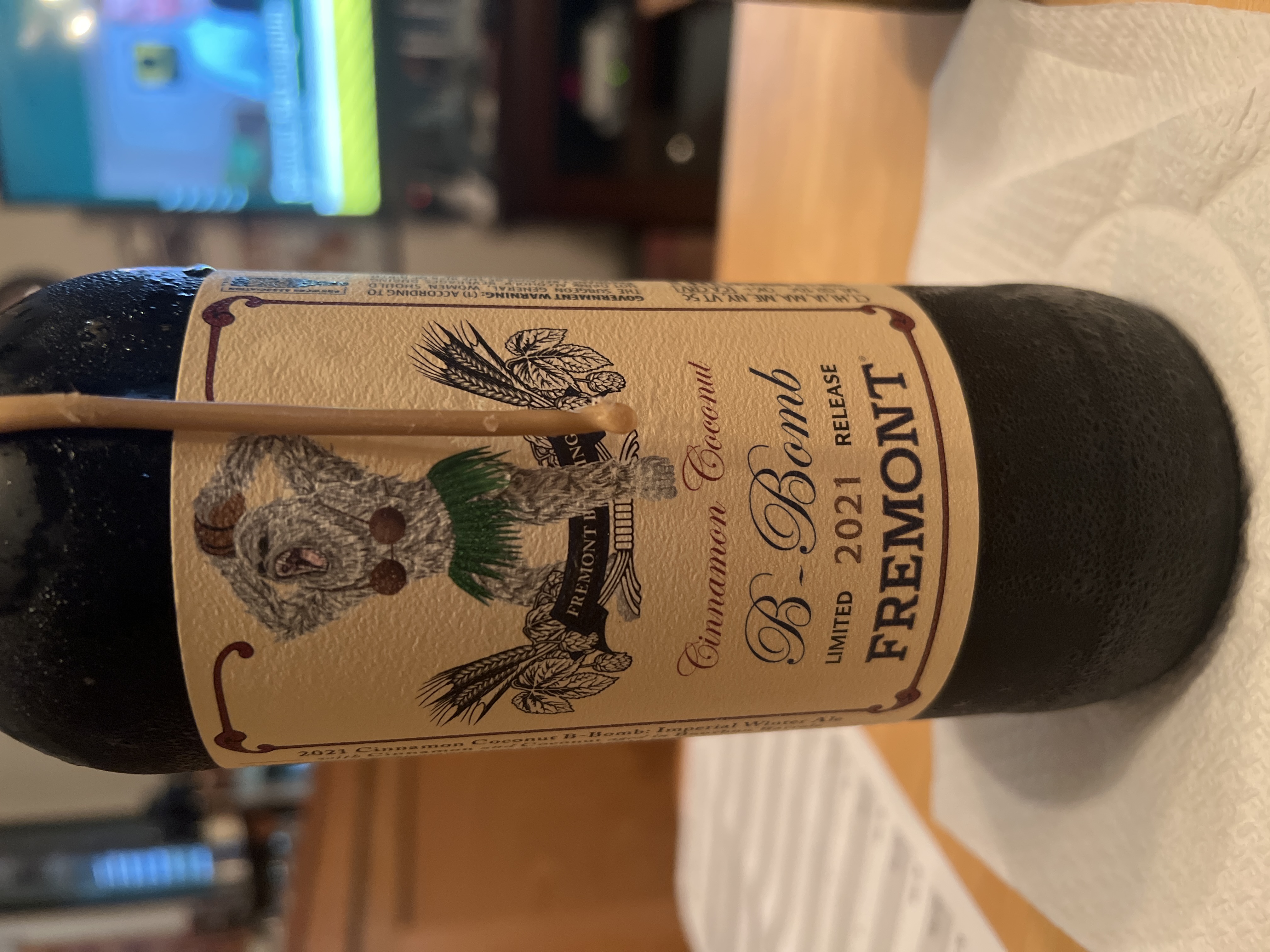 Bourbon Barrel Aged Imperial Winter Ale with Cinnamon and Coconut This year’s release of B-Bomb is aged in 8–12-year-old American Oak bourbon barrels and is a blend of 9, 12, and 24-month old barrel-aged Winter Ale. This special edition adds cinnamon and toasted coconut to complement the oak, cacao, leather, toffee, and dark coffee notes achieved from its extended barrel aging and barrel blending. Each barrel contributes a different note, and combining each barrel to create a coherent tone is a distinct art and true pleasure. Please do enjoy this unique barrel-aged ale today but know that Cinnamon Coconut B-Bomb will age gracefully for years to come. Don’t Be Afraid To Be Abominable. Down & Dirty: 2-Row Pale, Crystal-120, Munich, Roast Barley, Carafa-2, and Chocolate malts with Columbus, Willamette, and US Goldings hops with cinnamon and coconut. Color: Dark black, opaque Aroma: Coconut and cinnamon up front, followed with sweet aromatics of molasses, vanilla, chocolate and brown sugar. Whiskey, oak and graham cracker are present in the background Flavor: Highly sweet, with slight bitterness and lingering sweetness. Full body with smooth carbonation, a definite alcohol warmth, slight spice and mouthwatering.